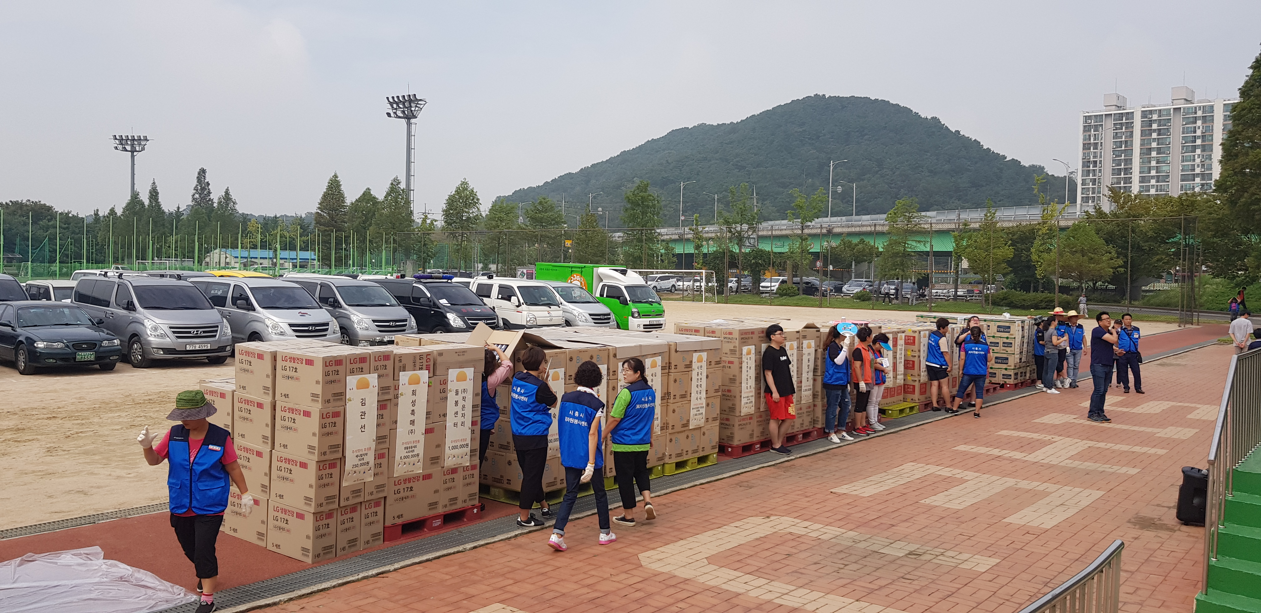 시흥시1%복지재단이 시흥시민과 기업 등이 전달한 추석 선물을 복지관 등 저소득 이웃을 위해 전달하는 온정 나눔 행사를 포동 운동장에서 9일 11시에 진행했다.
